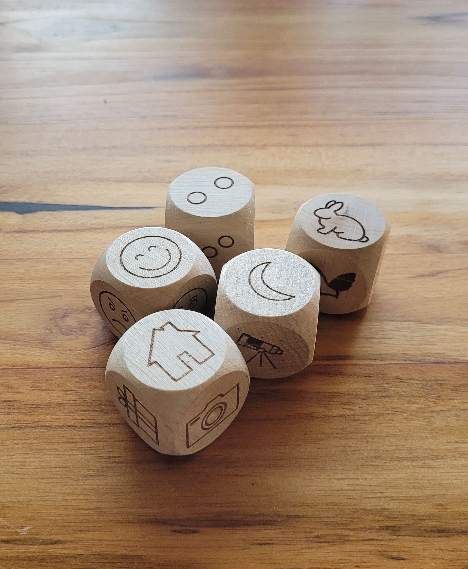 Wir bemühen uns, qualitativ gutes Holz zu beschaffen. Die Würfel werden von uns bearbeitet, geschliffen und poliert. Die Symbole lasern wir mithilfe eines Faserlasers blitzschnell. Danach kommt der Feinschliff - jeder Würfel wird zweimal gewachst und geölt.