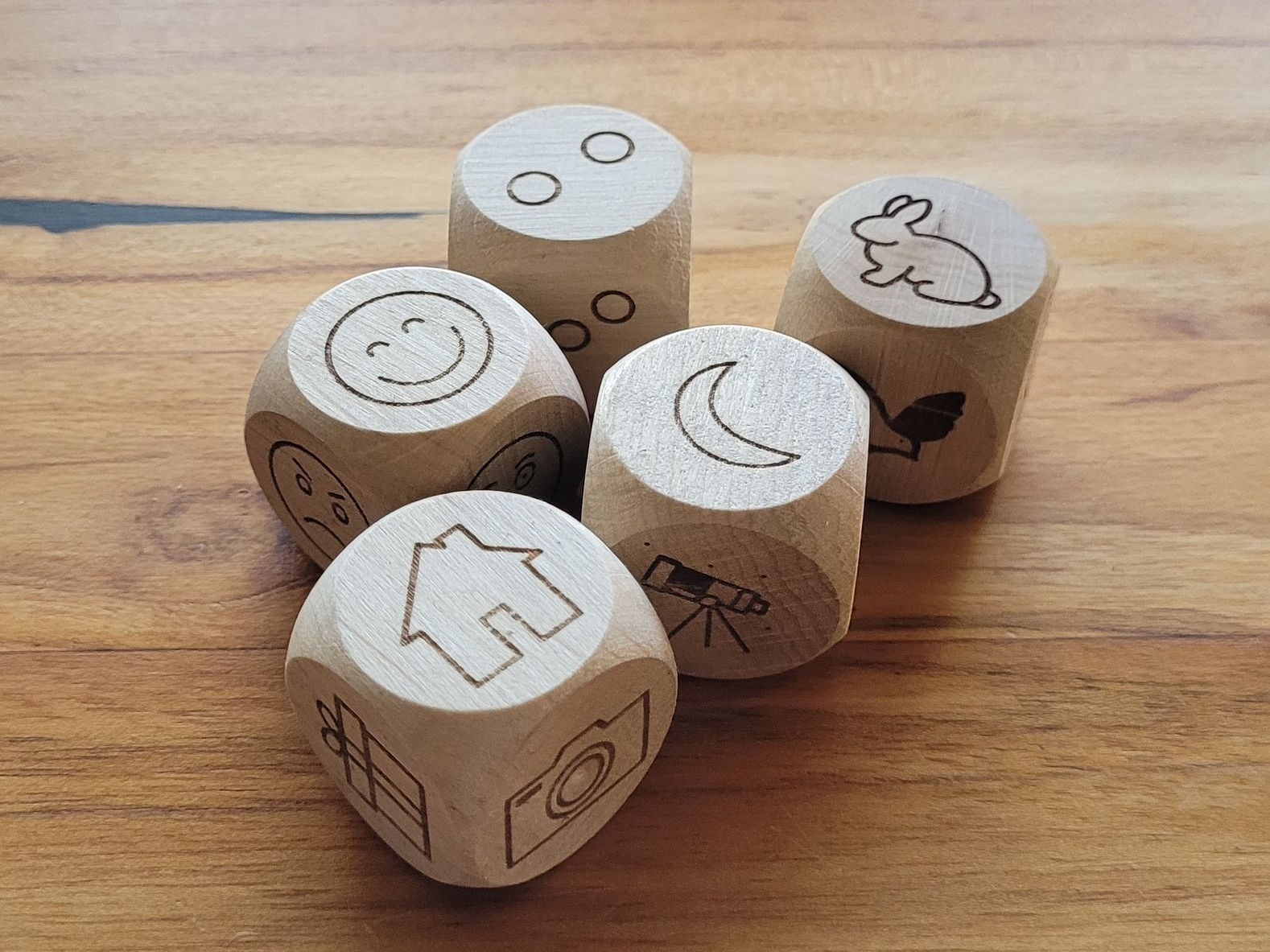 Wir bemühen uns, qualitativ gutes Holz zu beschaffen. Die Würfel werden von uns bearbeitet, geschliffen und poliert. Die Symbole lasern wir mithilfe eines Faserlasers blitzschnell. Danach kommt der Feinschliff - jeder Würfel wird zweimal gewachst und geölt.
